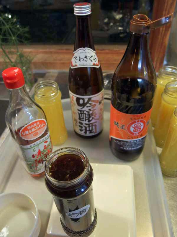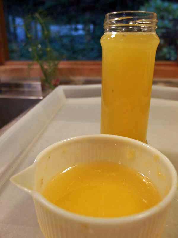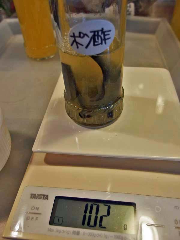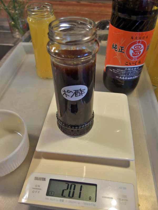 これをを瓶に入れ量りにのせ、目盛りをゼロにして、酢を20g、ダイダイの絞り汁を80g入れ・・・