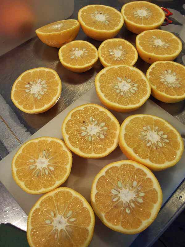 半分に切った夏みかん、未だ熟していないので中がギュッとしていて絞るのが大変でした。