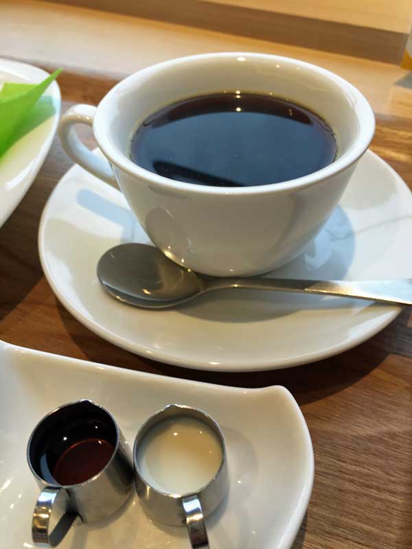 コーヒーには、未精製の糖のシロップと豆乳が添えられています。