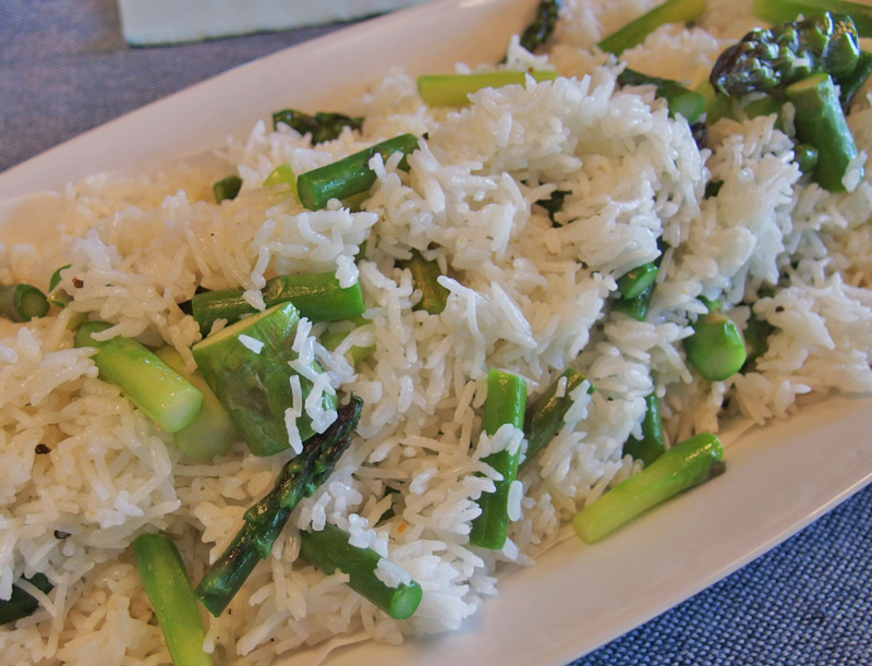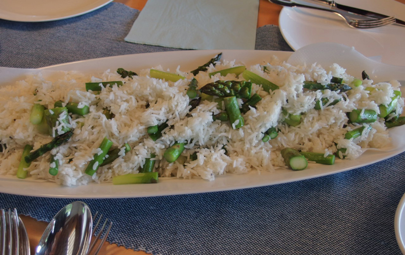 この本には、ご飯を硬めに炊いて、そこへズッキーニを蒸したものを入れ、塩、胡椒、オリーブ油、レモン汁、パルメザンチーズで味をつける「ズッキーニのリゾット」が紹介されています。 さっぱりしていてズッキーニの緑が美しい、夏にぴったりのリゾットで、何度も作りました。 これをアスパラガスで作ってみようと思ったのです。 お米は半分バスマティライスにし、アスパラガスは蒸さないで、濃い塩水で固めに茹でて炊き立てのご飯に混ぜ、味を調え、銘々がチーズをふって頂きました。