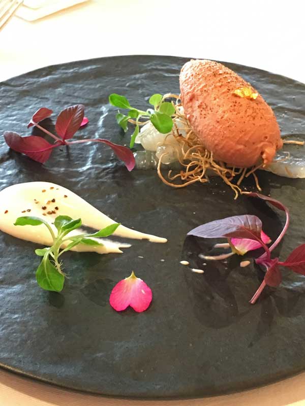 レバーのパテ、針牛蒡の素揚げと玉ねぎのマリネが下に敷いてあります。白いのはチーズのクリームとのこと、お花も全てエディブル・フラワーです。