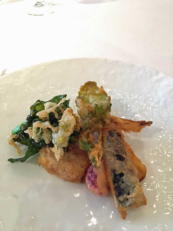 野菜のベリエ(衣揚げ)、衣はビールでのばしてサクサクにしてあるとのこと、ラディッシュ、アスパラガス等々季節の野菜が一杯