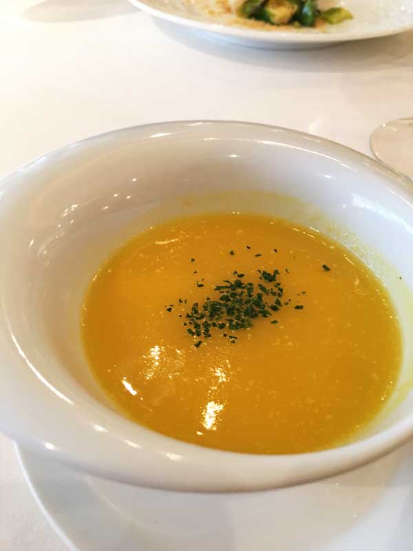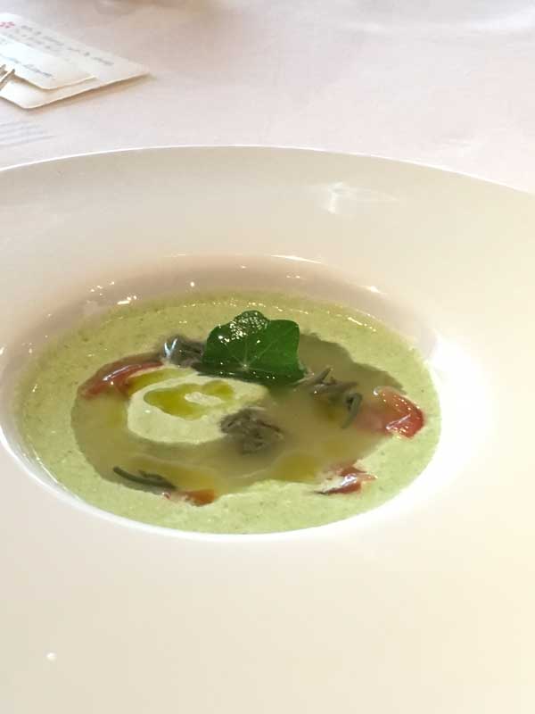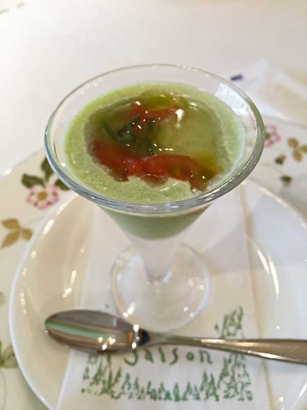 私が最初にいただいたアスパラガスのクリーム仕立てです。器が違うと違うお料理のように見えます。