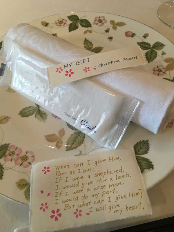 そしてセッティングされたテーブルのお皿に置いてあるカードの文章を全部読んで、自分のとった単語を表す文章を見つけたらそこに座ります。