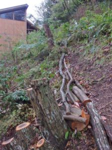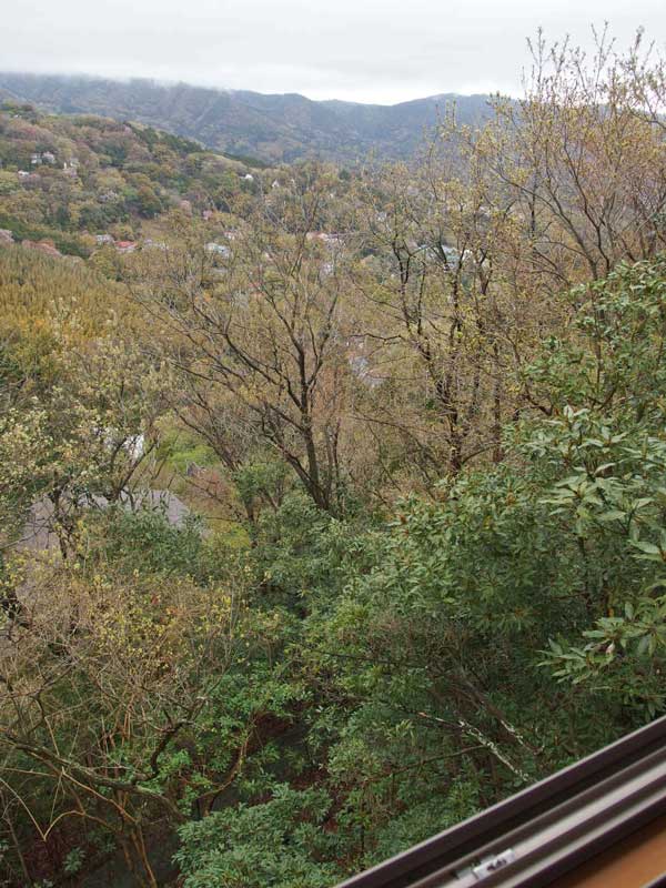 コナラの金色の芽の輝きが反射して不思議なな光に包まれているテラス、温度計を見ると8度でした。