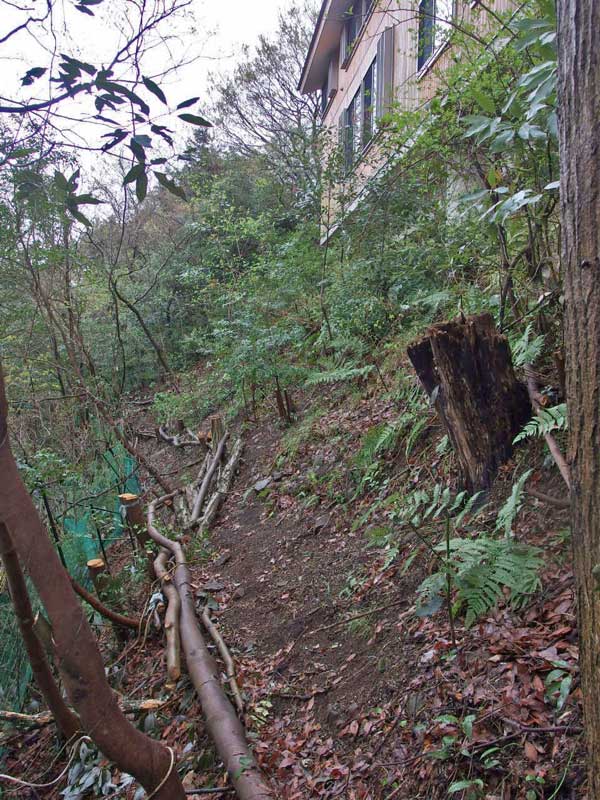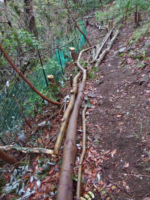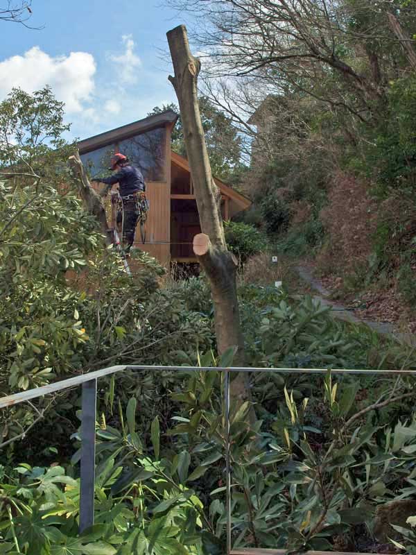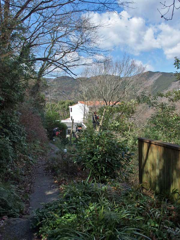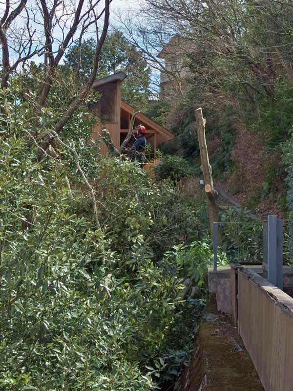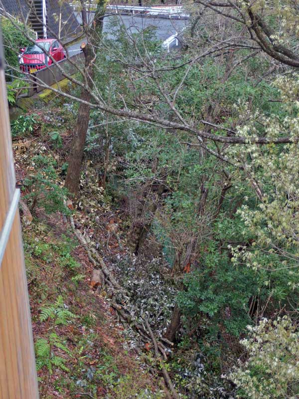木に登ったりチェーンソーを使って切る大きな木はお坊さんにお任せして、ノコギリと刈込鋏で切れる小さな木と灌木は私の役目です。崖地の外仕事は危険なので、お坊さんが伐採に来る日だけ私も作業することにしました。