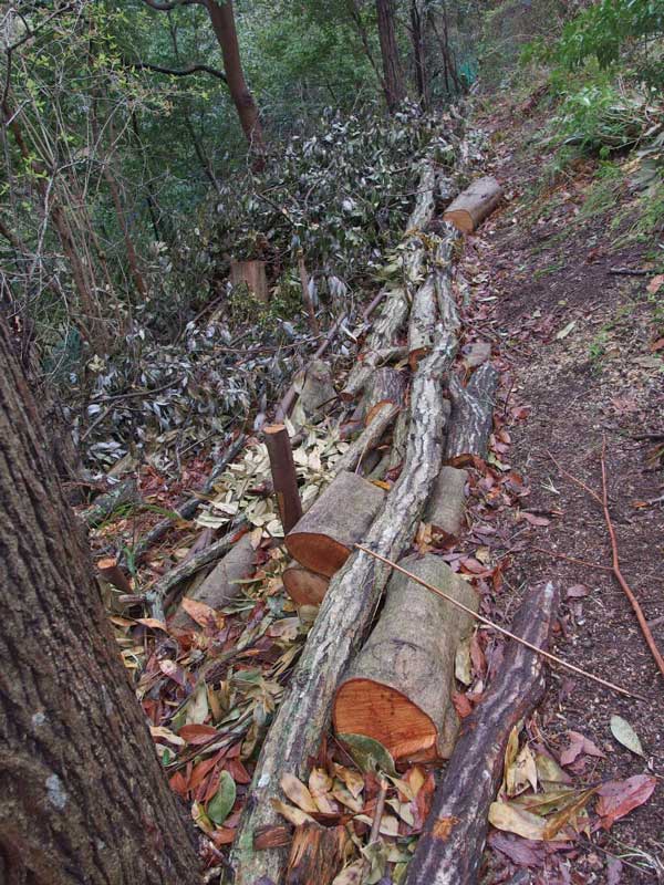 切り倒した木の枝を払い、払った枝葉は邪魔にならない場所に集め、幹は道にしたい場所に置いて行きます。