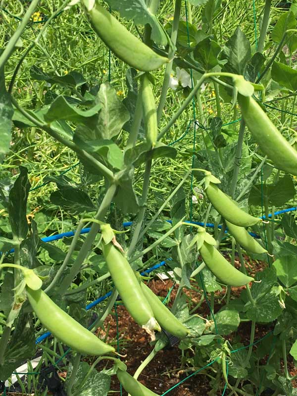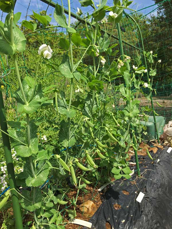 スナップエンドウは白い花をつけ、下の方は鞘になっています