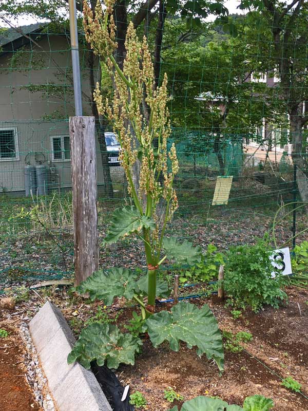 ルバーブが私の背より大きくなって花を咲かせ