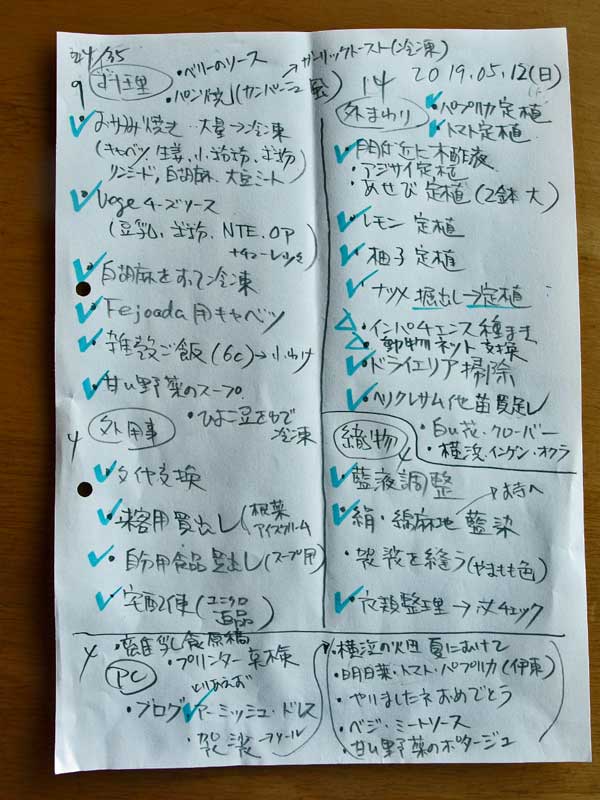 内訳は料理が9、家の中の整理が1、外回りが14、外出する用事が4、織物が3、パソコンが4、です。驚いたのは本業の織物に関することが、たったの3つで10%以下。本業以外の暮らして行くためにする事の何と多い事。