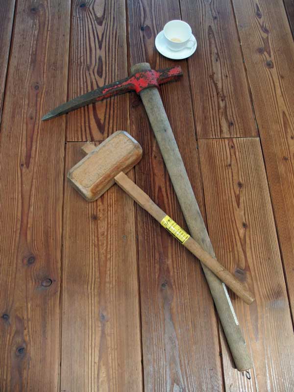 苗木を植えるための穴を掘るツルハシは2,5kg、動物除けのネットを張るための杭打ちの木槌はこの大きさです。パーマカルチャーを言うは易しく行うは大変です。