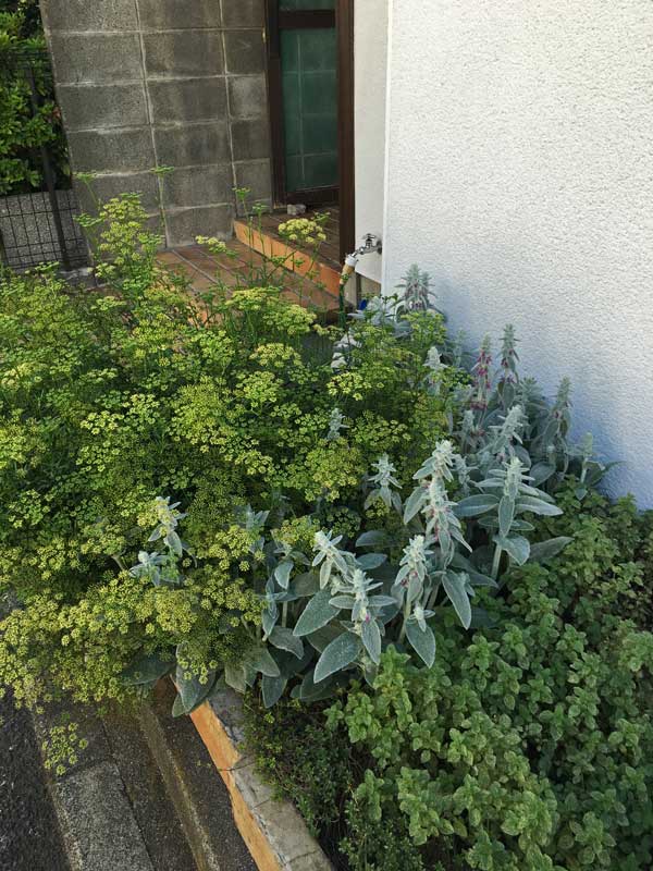 昨年春植えたラムズ・イアーは、今年になって初めて花が咲きました。先輩のパセリの勢いに押され気味です。