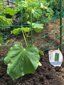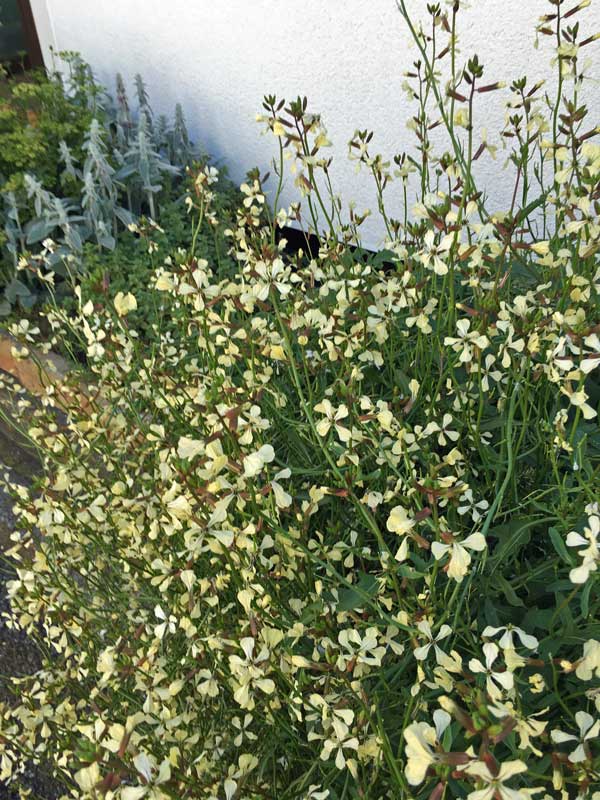 手前の白い花はルッコラ、1年半前の改修工事後の殺風景な玄関脇を思うと夢のようです。