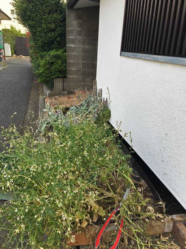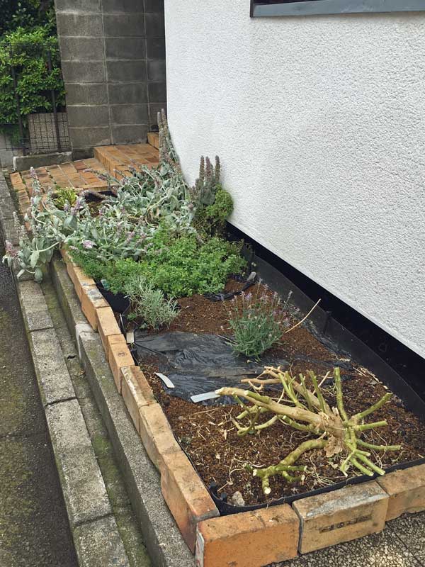 玄関に近づくと何か変! あの愛らしいピンクの花が咲こうとしていたラムズ・イアーが、萎れて瀕死の状態です。私は玄関に荷物を置いて、着替えもしないでハーブを救うために作業を始めました。