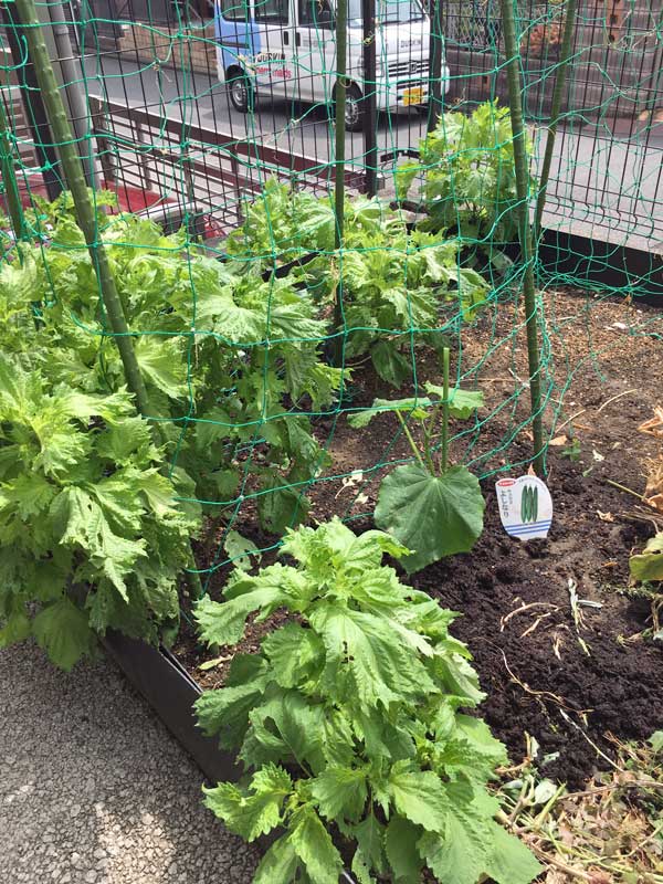 胡瓜の周りにフサフサ生えているのは、青紫蘇=大葉です。昨年育てたののこぼれ種なのですが、庭の片隅を占領るほど沢山育っています。