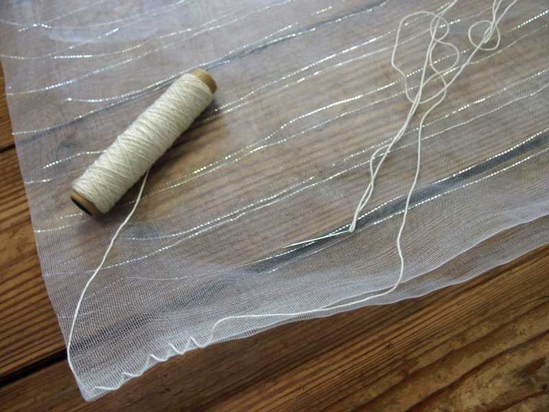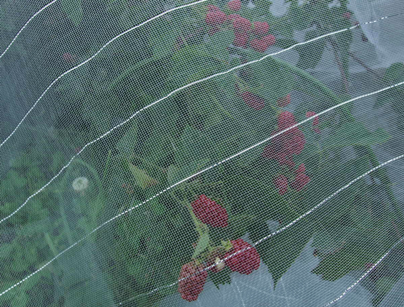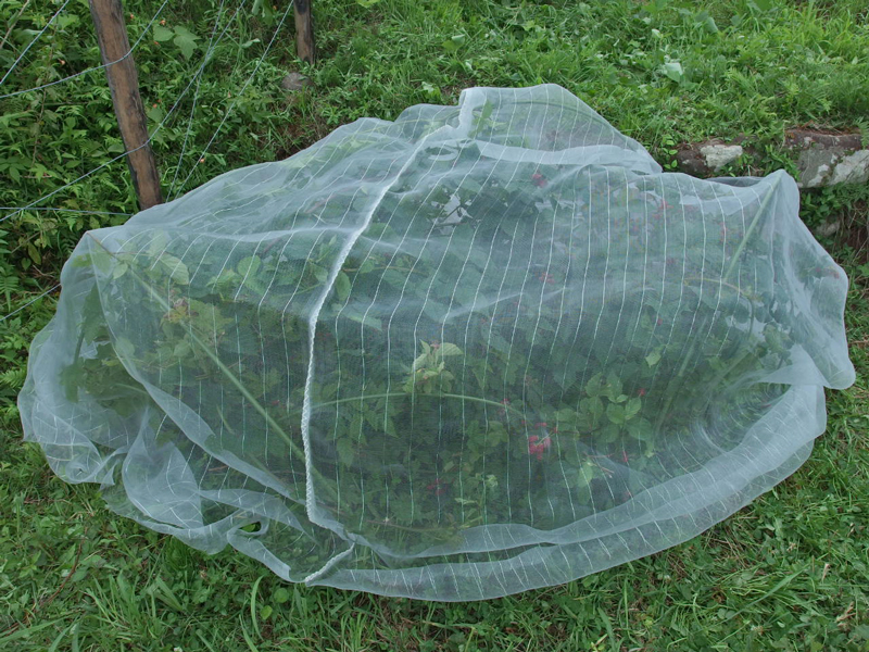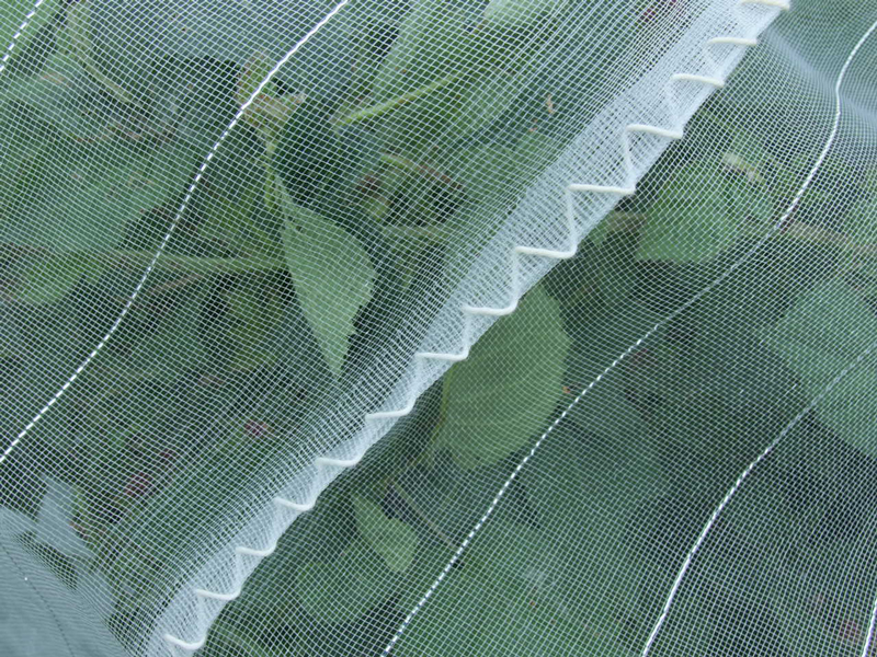 幅2,1メートルの農業用寒冷紗(網戸のような素材です)を5メートル買ってきました。 それを半分に折って一辺を縫い、三角の袋のようにして全体を覆えるように作ってみました。