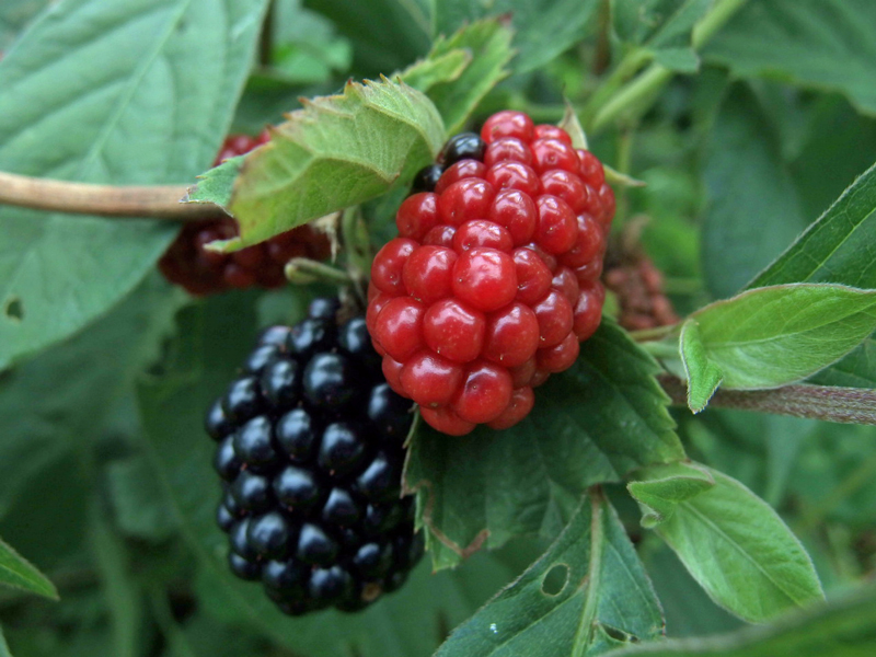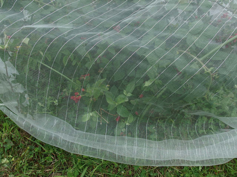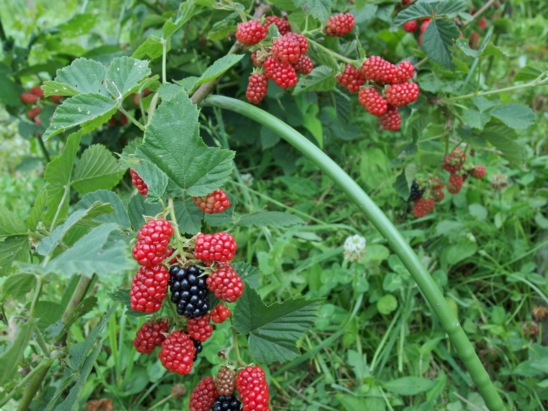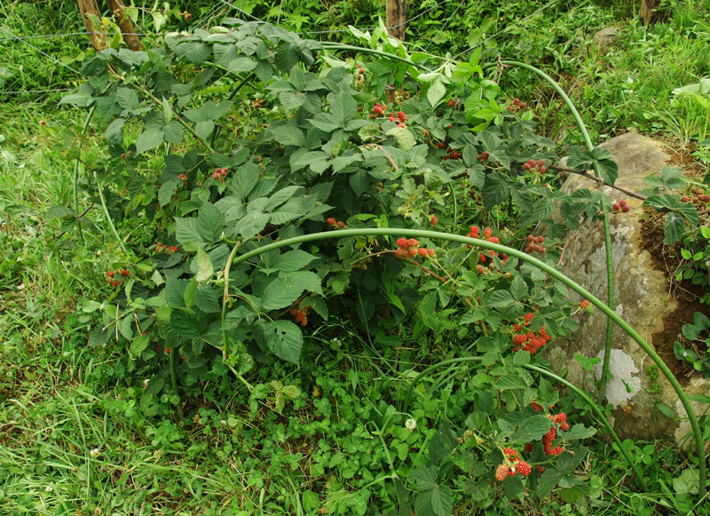 下の畑の片隅に植えたブラックベリーが色づいてきました。 先日このブラックベリーに鳥よけのネットをかぶせようと周りの草を刈っていた時、蜂に刺されました。 ネットをしっかりかけないと鳥は隙間から入って、美味しそうなのからドンドン食べてしまいます。 鳥がベリーを食べてしまうのに気づく前は、花があんなに咲くのに、青い実が沢山つくのに、どうして赤い実がならないのだろう? と、不思議に思っていました。 人間が畑を見回るより頻繁に鳥は畑を見回っているのです。