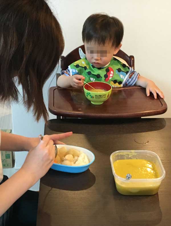 今月タスカジに伺った日は、たまたまお母さんが早く帰宅なさったので、坊やが作り立ての甘い野菜のポタージュを飲むのを見学できました。