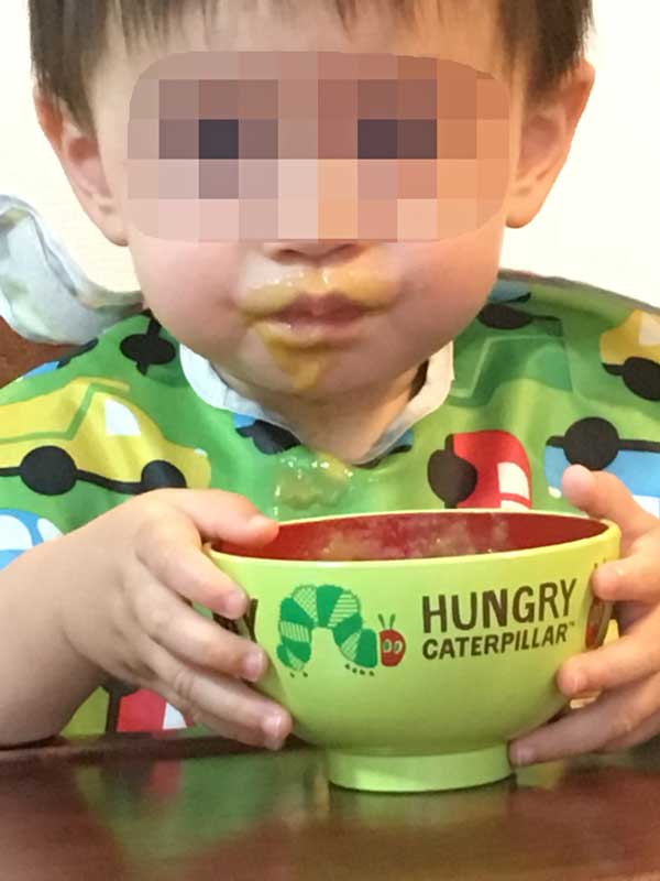 タスカジで野菜料理を作らせて頂いているお宅の赤ちゃん。もう1歳半で今は赤ちゃんではないのですが、赤ちゃんだった頃から私の作る甘い野菜のポタージュが大好物なのです。この写真は、坊やがどんなにポタージュが大好かを私に伝えたくて、お母さんが送って下さったものです。
