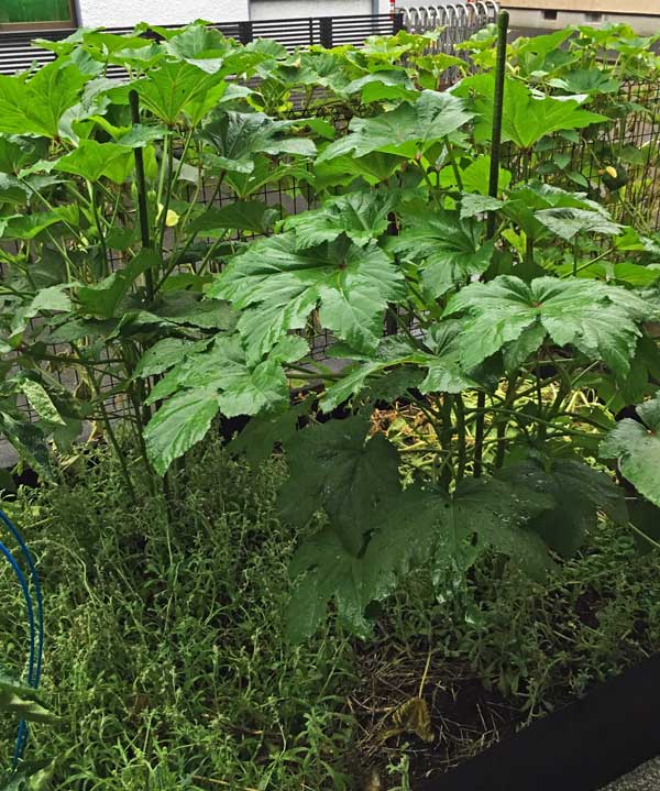 昨年のこぼれ種の青紫蘇も1メートル近くの大株に育っています。大根おろしにちぎって混ぜ、焼き魚に添えるのはMさんの定番。素麺や冷ややっこの薬味に、ご飯をのせて包んで食べたり、ベトナムの生春巻きやお好み焼きにもハーブとして欠かせません。