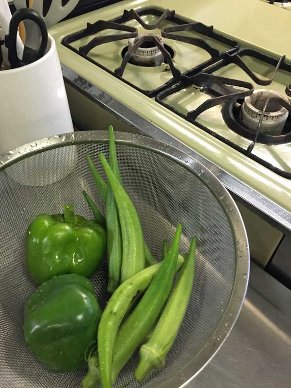 街の中の小さな庭で、このように簡単に美味しい野菜が食べきれないほど育つとは、予想していませんでした。この日はオクラは塩湯に通して小口切りにして、パプリカは千切りにしてモヤシとサッと炒めて、どちらも保存容器に入れてMさんの作り置きにしました。