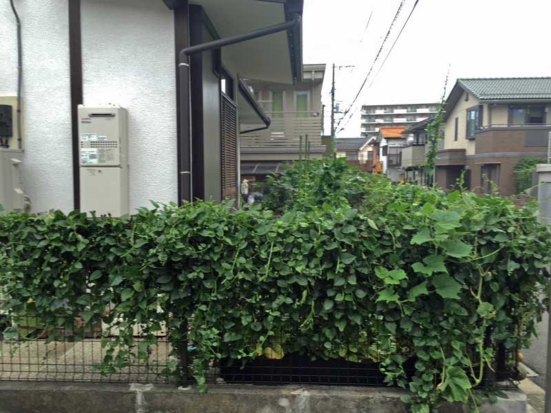 この夏の横浜の家のフェンスは、ツルムラサキとカボチャの生垣です。