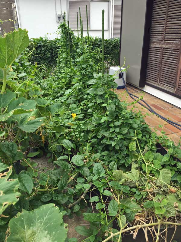 ツルムラサキは昨年のこぼれ種、カボチャは生ゴミを埋めていた場所から芽が出てきたものです。