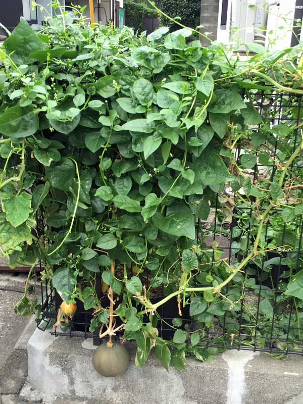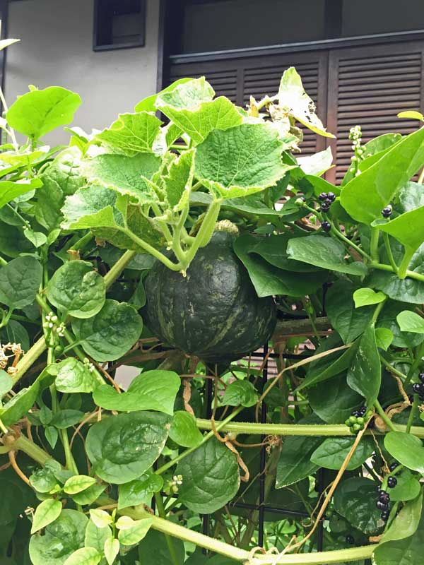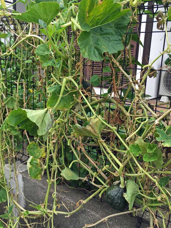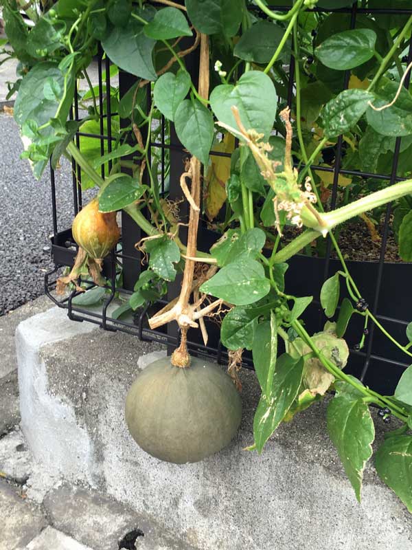 カボチャはうどん粉病が発生して、白くなった葉を取り去ったり自家製の薬をスプレーしたりしました。住宅街で蜂がいなくて受粉しないのが分かってから、朝見回って受粉を始めたら実を結ぶようになりました。