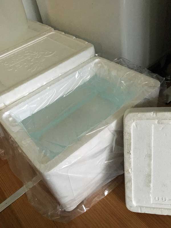 食品宅配会社の保冷箱に厚手のポリ袋をしき