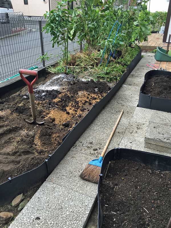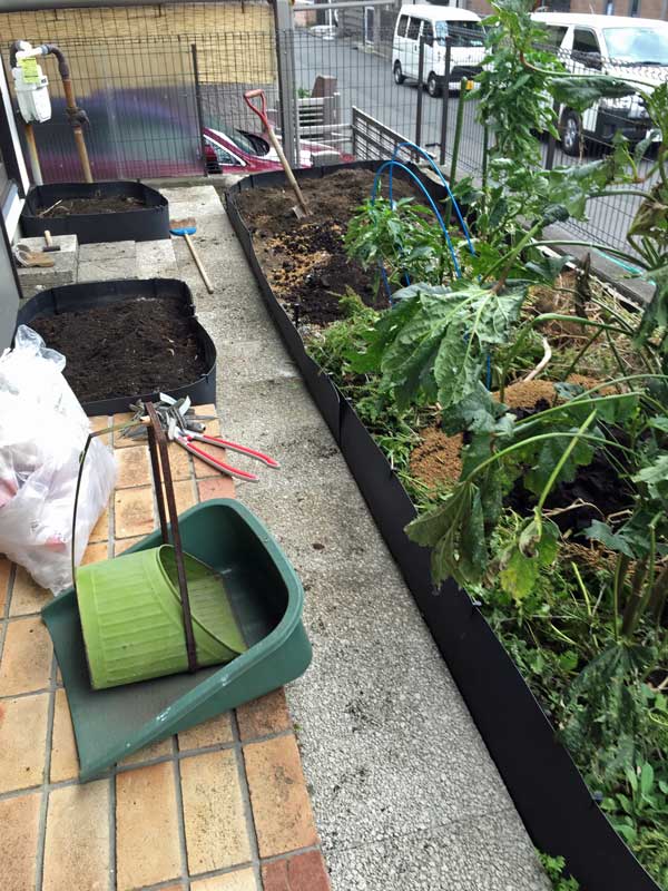 この夏Mさんの体調が悪くなってから放りっぱなしにしていた夏野菜を整理して、土や肥料を入れなおして、大根の種を播きました。