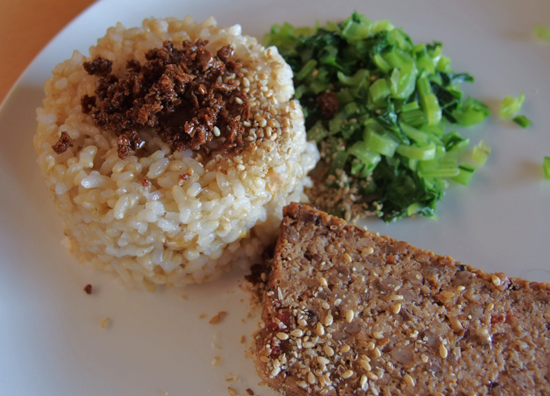 ひよこ豆入り玄米ご飯には白胡麻とセータン(生麩)の醤油漬けをかけて頂きました。