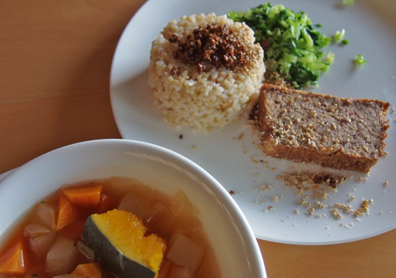 先週、外食をちょっと続けたらパワーダウンしてしまったので、反省して、玄米ご飯を炊き、体の陰陽を調えるスープをとりあえず作りました。 冷凍してあったベジローフを出して、畑の小松菜を炒めて、夕食にしました。