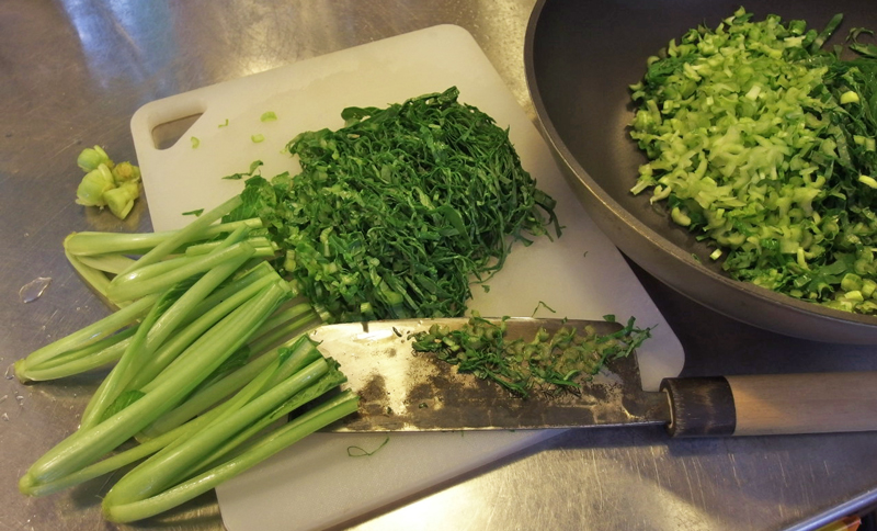 玄米ご飯と青菜の炒めたのはとても合います。 この時使った小松菜は我が家の菜園の虫食いだらけのもので、葉っぱはほとんど使えず主に茎だけだったのですが、味も歯触りも素晴らしく、これだけでご飯を何杯も頂けるほどでした。 どうしてこんなに美味しいのか、野菜作りをしていてよかったね、と、Mさんと話しました。