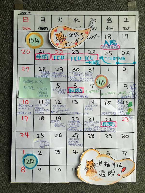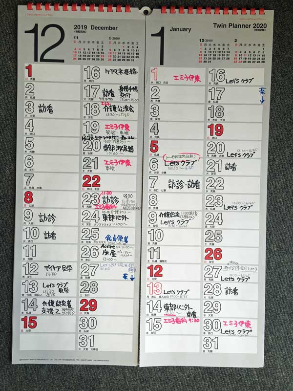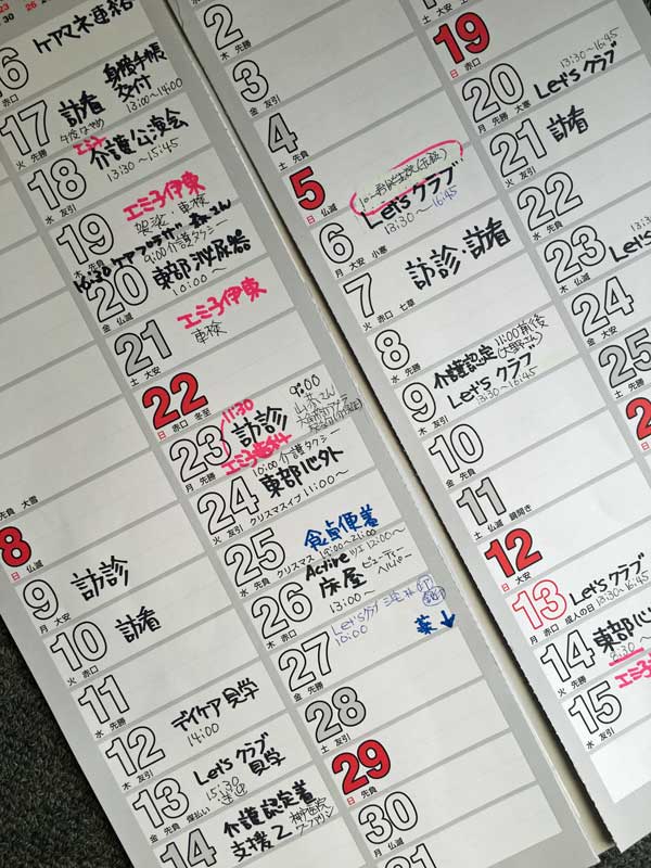 それから訪問診療と看護をお願いしての自宅療養が始まりました。介護保険も申請中のスタートでした。訪問診察と看護、病院外来、薬、リハビリ、それに加えて私のスケジュールなので、2か月は見渡せて予定を書き込めるるカレンダーが必要でした。