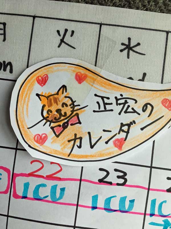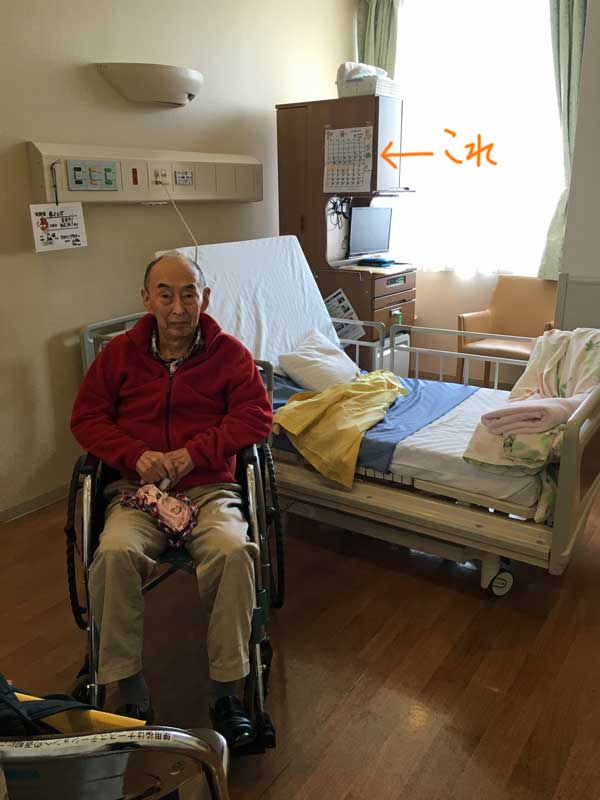 Mさんは手術後、立ち上がると血圧が下がってしまう(上が60代とか)状態が続き、立って歩くリハビリが出来ず、リハビリのために転院しました。転院先で手作りのカレンダーを忘れたのに気付き、新たに作ったのが・・・