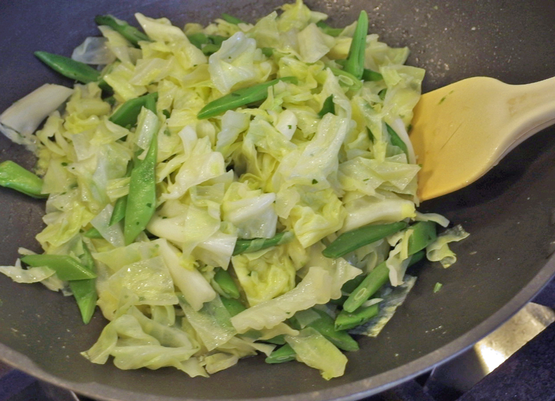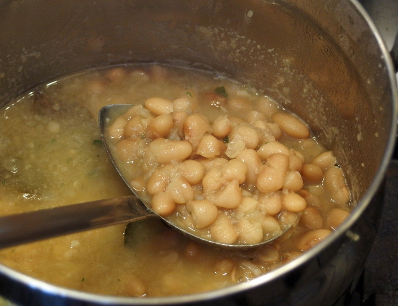 カナリオ豆を一晩水に浸してから柔らかく煮て、ニンニクと玉葱を炒めたものを合わせ、少し煮込みます。 そして、付け合わせの野菜にもサヤインゲンを使いました。