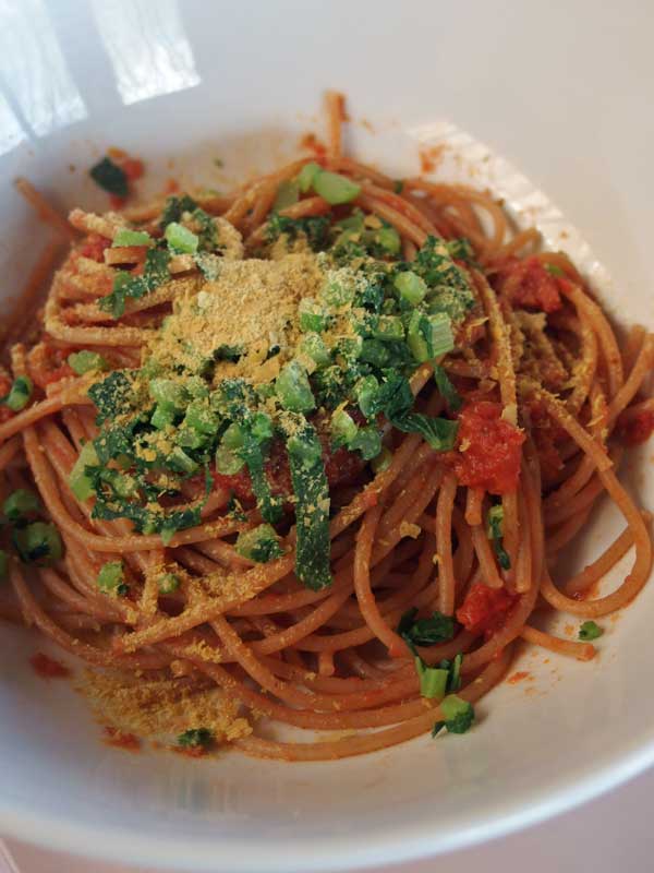 ここでちょっと味を見てみました。ソースは優しい味で美味しいのですが、パスタは太めでちょっとボソボソ、これだけだと何だかわびしい感じです。