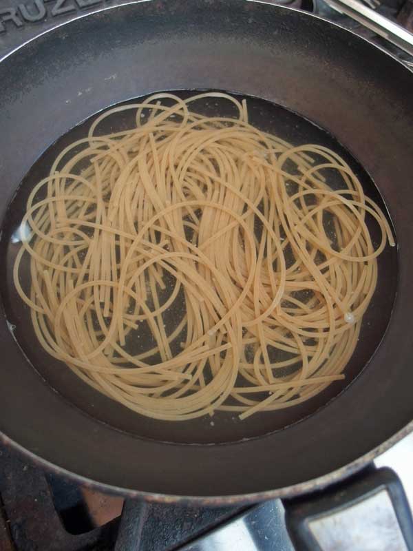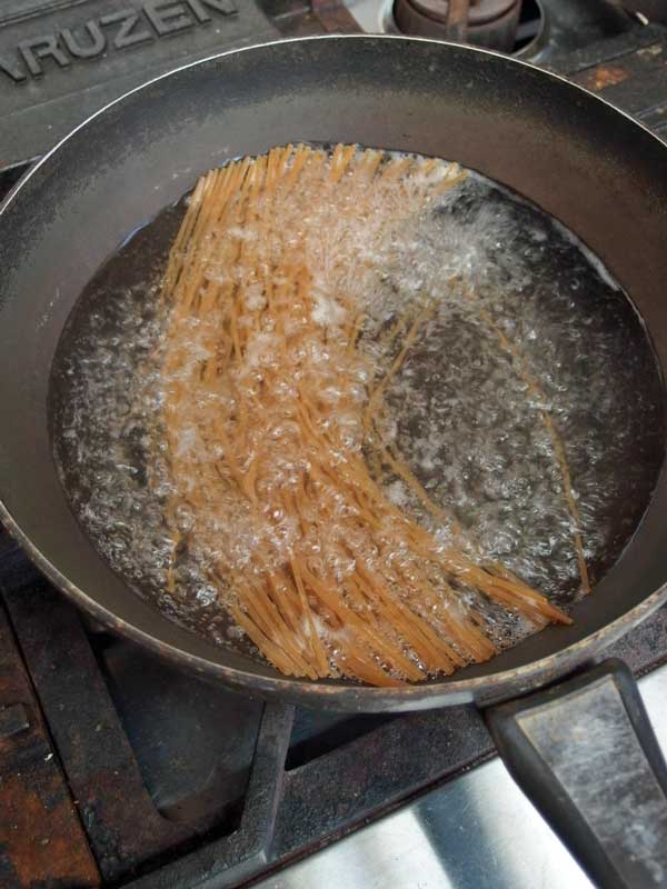 お湯を沸かして塩を入れ、パスタを茹で始めます。