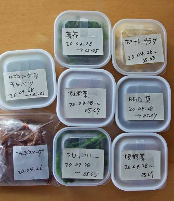 4月28日に発送した料理。保存ケースの容量は550mlの大型で、茹でた青菜なら1束以上ブロッコリーなら1個分が入る大きさです。