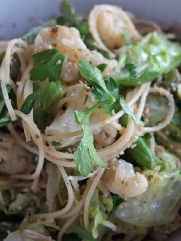 穀類、野菜、蛋白質、それ胡麻等のナッツ類が加われば、これ一皿でバランスの良い一食になります。作るのに時間もかからないし本当に楽! 私の3日に1度はパスタは続きそうです。