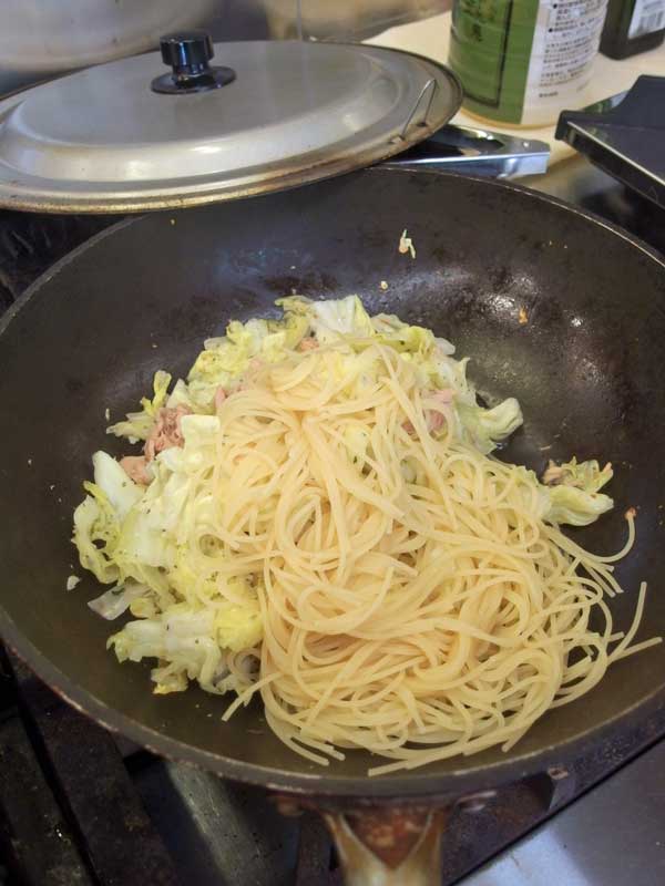 残りの茹で時間が1分半くらいになったパスタをザルにあけ湯を切り、鍋に加えます。
